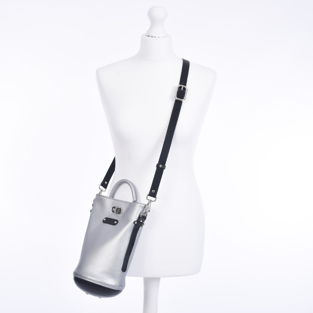 A striking combination of silver grain Italian leather, black Veg Tan base and straps with chrome fittings and the signature silver lining.